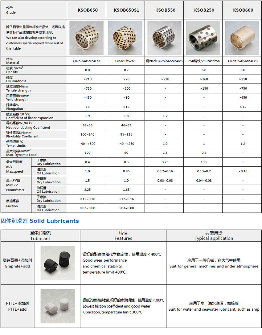 KSOB650 系列固體自潤滑軸承以高強度銅合金為基體并按工況需要有規律的排布一定比列的固體潤滑劑,這種銅基鑲嵌式固體潤滑軸承結合了銅合金的高承載高耐磨及固體潤滑劑的自潤滑性能,使其在使用過程中大大降低了軸承和設備的維護成本。在此基礎上開發了適合于經濟型和耐沖擊型運用的KSOB550 鋼基銅合金鑲嵌型固體潤滑軸承、KSOB250 鑄鐵鑲嵌型固體潤滑軸承和KSOB850 彌散型固體潤滑軸承。